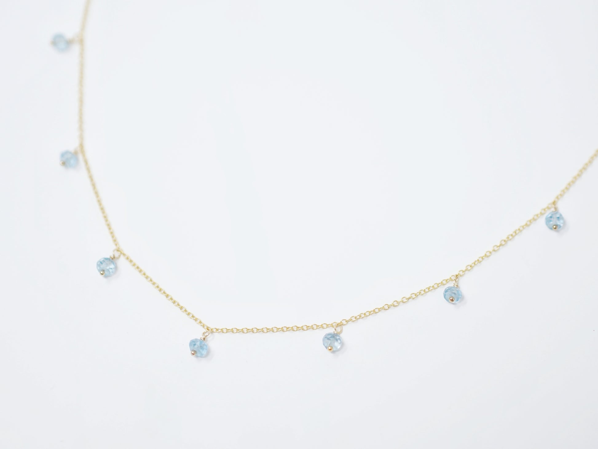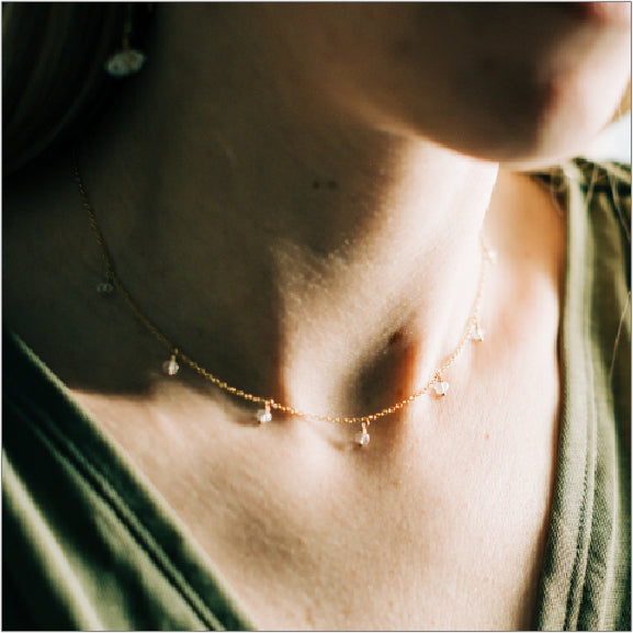 Dainty little gemstones hanging on a beautiful gold or silver chain. Also available with a matching bracelet.